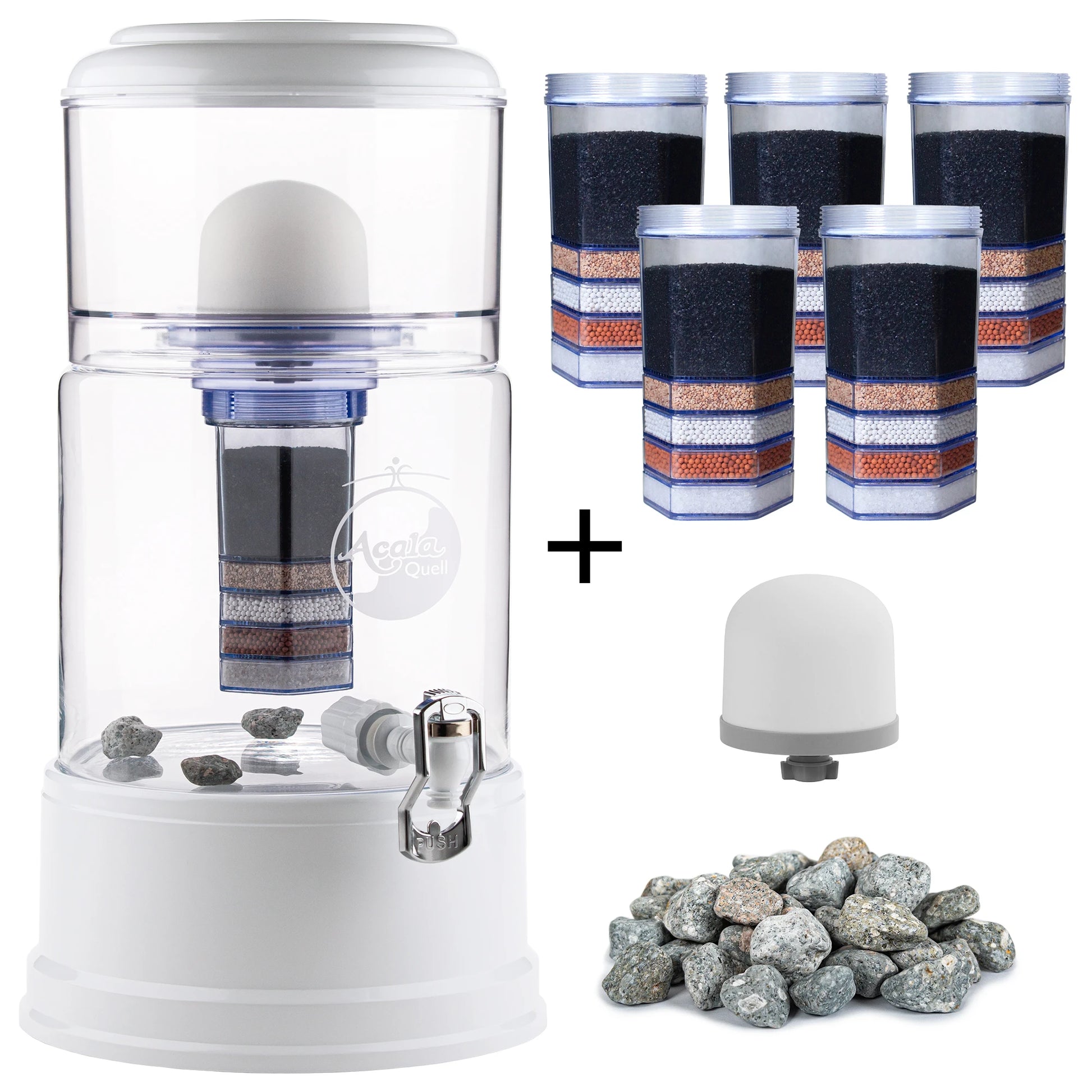 Mit diesem Paket sind Sie zwei Jahre versorgt. Sie erhalten Sie einen AcalaQuell® Grande inklusive einem Keramikfilter, einer AcalaQuell® Premium Kartusche und Mineralsteinen - zusätzlich erhalten Sie fünf weitere AcalaQuell® Premium Kartuschen, einen weiteren Keramikfilter sowie ein zweites Mineralsteine-Set.