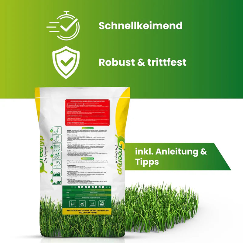Greenyp Berliner Tiergarten besteht die für alle Garten-, Gebrauchs- & Zierflächen verwendet werden kann. Die ausgewählten Gräsersorten garantieren eine schnelle Keimung und einen dichten Wuchs. Durch die Fähigkeit des Rasens, sich nach intensiver Nutzung schnell wieder zu regenerieren, erscheint die Rasenfläche auch nach sehr starker Beanspruchung schnell wieder im alten Glanz.