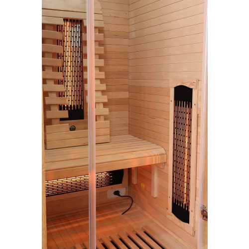 Das elektronische Bedienelement erlaubt eine einfache Steuerung aller Funktionen. Farblichttherapie und Leselicht schaffen eine angenehme Atmosphäre, während die 8 mm Sicherheitsglas-Front und das edle Hemlock-Holz für Stil und Langlebigkeit stehen.