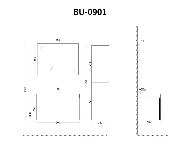 • Abmessungen Unterschrank: 900 mm x 560 mm x 480 mm